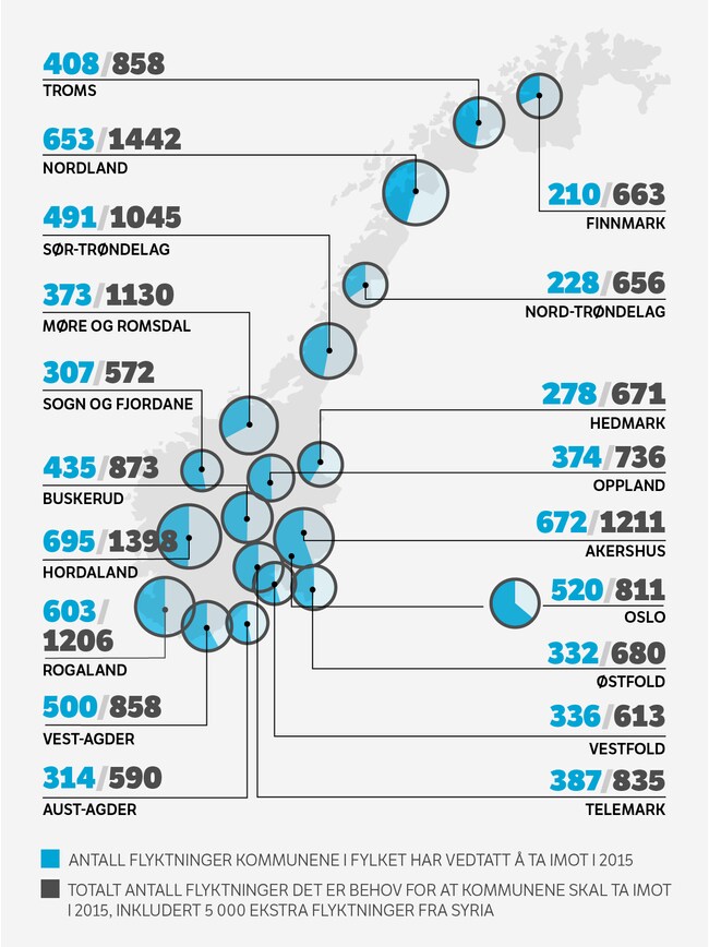 Vanligvis bruker vi kart fordi det er et poeng å vise hvor steder er eller hvor et fenomen faktisk opptrer. Dette kartet fra NRK har et greit utgangspunkt med et enkelt bakgrunnskart eg et kakediagram for hvert fylke.